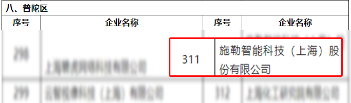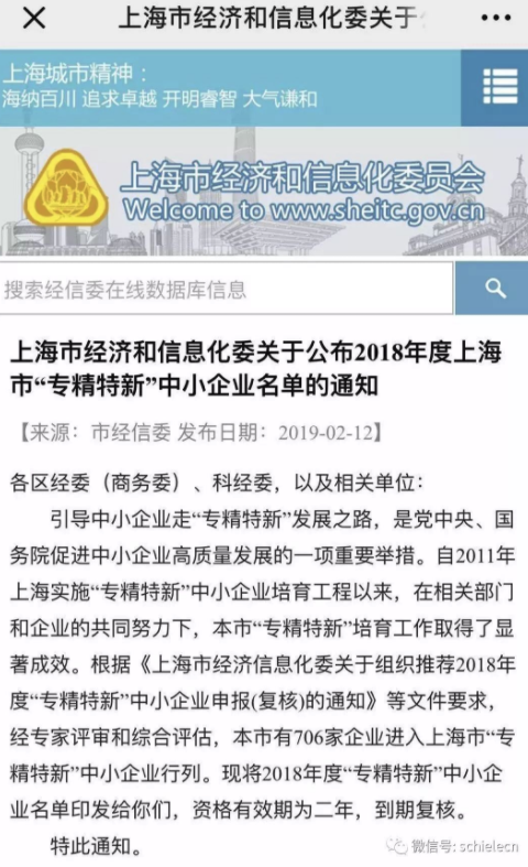 2月12日,上海市经济和信息化委员在官网发布《上海市经济和信息化委关于公布2018年度上海市“专精特新”中小企业名单的通知》(沪经信企〔2019〕91号),施勒智能科技(上海)股份有限公司(简称“施勒智能”)名列其中。